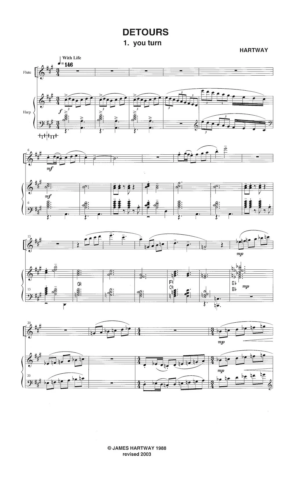 "Detours" is a three-movement work for flute and harp that is casually based on its programmatic subtitles:
